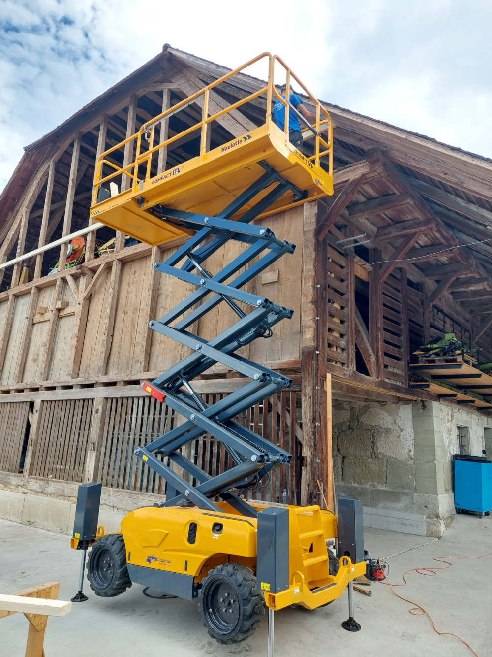 Mit ihrer hohen Durchfahrtshöhe arbeiten die Compact Scherenarbeitsbühnen auch in unwegsamstem Terrain. Mit einer Tragfähigkeit von 450 kg und 3 Bedienern können sie auch die schwierigsten Aufgaben bewältigen. Die Stabilisatoren ermöglichen es Ihnen, auch auf sehr unebenem Gelände zu arbeiten.
